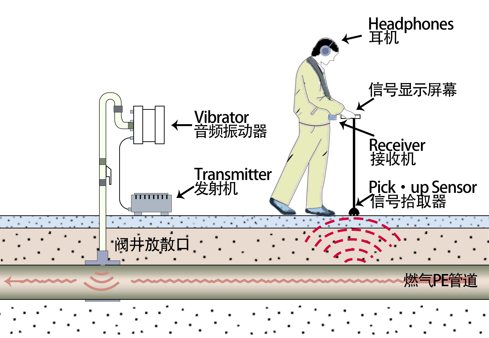 主動(dòng)聲源探測(cè)法是通過(guò)音頻器發(fā)射裝置向燃?xì)夤艿纼?nèi)發(fā)射特定頻率的聲波信號(hào),信號(hào)沿管道定向傳播至遠(yuǎn)端,該聲波信號(hào)在管道壓力氣體中定向傳播的同時(shí),通過(guò)管壁土壤傳播至地面;同時(shí)接收機(jī)在地面上捕捉該聲波信號(hào),通過(guò)地表持續(xù)接收信號(hào)的強(qiáng)弱值而進(jìn)行精準(zhǔn)定位法。