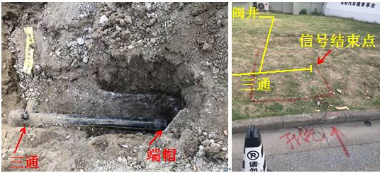 在信號(hào)結(jié)束的地方見到了管道的端帽,表明前面再無(wú)管道,開挖見到三通,確定了在空調(diào)機(jī)下的閥井與管道的連接關(guān)系。