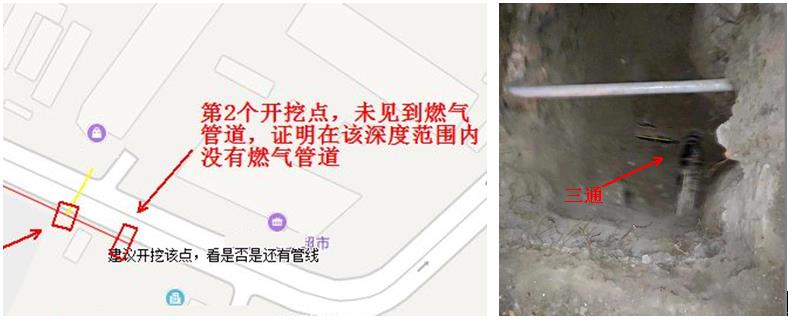 在了解到燃?xì)夤驹?007年前后均無(wú)穿越(頂管或者拖拉管)管道施工之后,我們決定在這兩個(gè)無(wú)信號(hào)的位置開挖,證明原圖管道不存在或者是由于聲源信號(hào)自然衰減造成的信號(hào)消失。