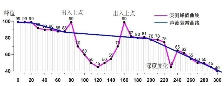 如下圖,假設(shè)閥井內(nèi)信號(hào)源位于橫坐標(biāo)0m處,沿橫坐標(biāo)探測(cè)距離300m,附近信號(hào)峰值距離信號(hào)源一定距離后,信號(hào)值逐步自然衰減,在管道出入土點(diǎn)位置信號(hào)異常強(qiáng)烈,隨后在穿越管段段內(nèi)迅速減弱。